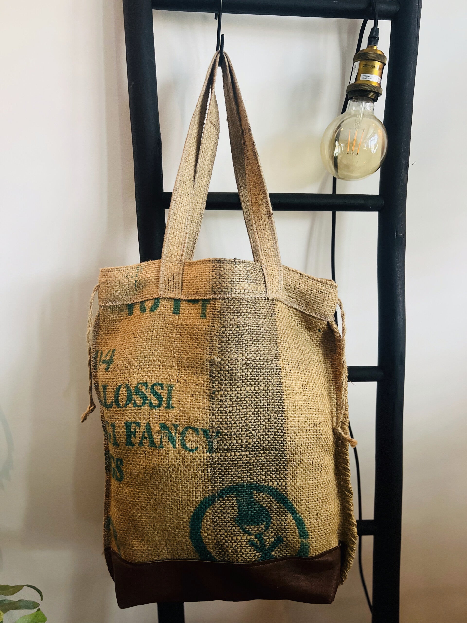 Deze jute tas combineert stoer en duurzaam met een uniek detail:hanfgemaakte leren accenten afkomstig van oude autostoelen. het reslutaat ? Een stijlvolle, milleubewuste tas met een verhaal.